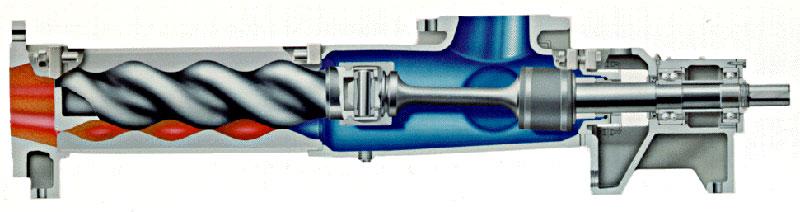 首先,該螺桿泵是一種內嚙合回轉式容積泵,當單線螺旋的轉子在雙線的螺旋的定子孔內繞定子軸線作行星回轉時,轉子一一定子付之間形成的密閉腔就連續的、勻速的、容積不變的將介質從吸入端輸送到輸出端。